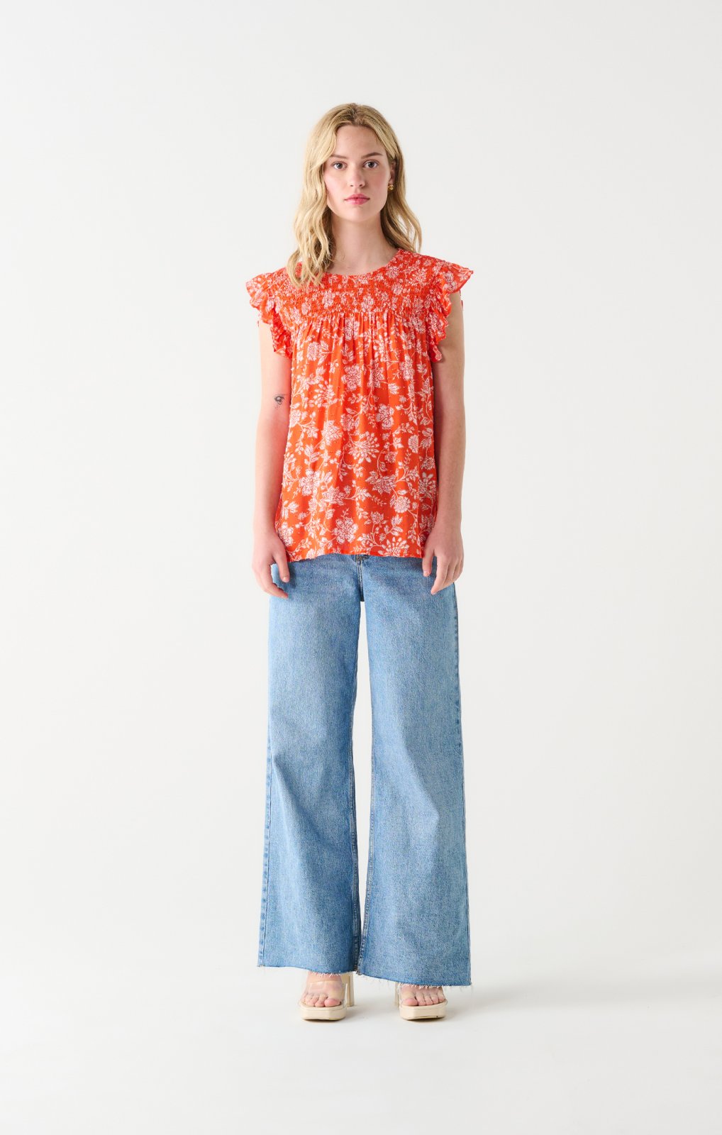 Dex Ladies Orange Cream Vine Floral Printed Flutter Sleeve Top