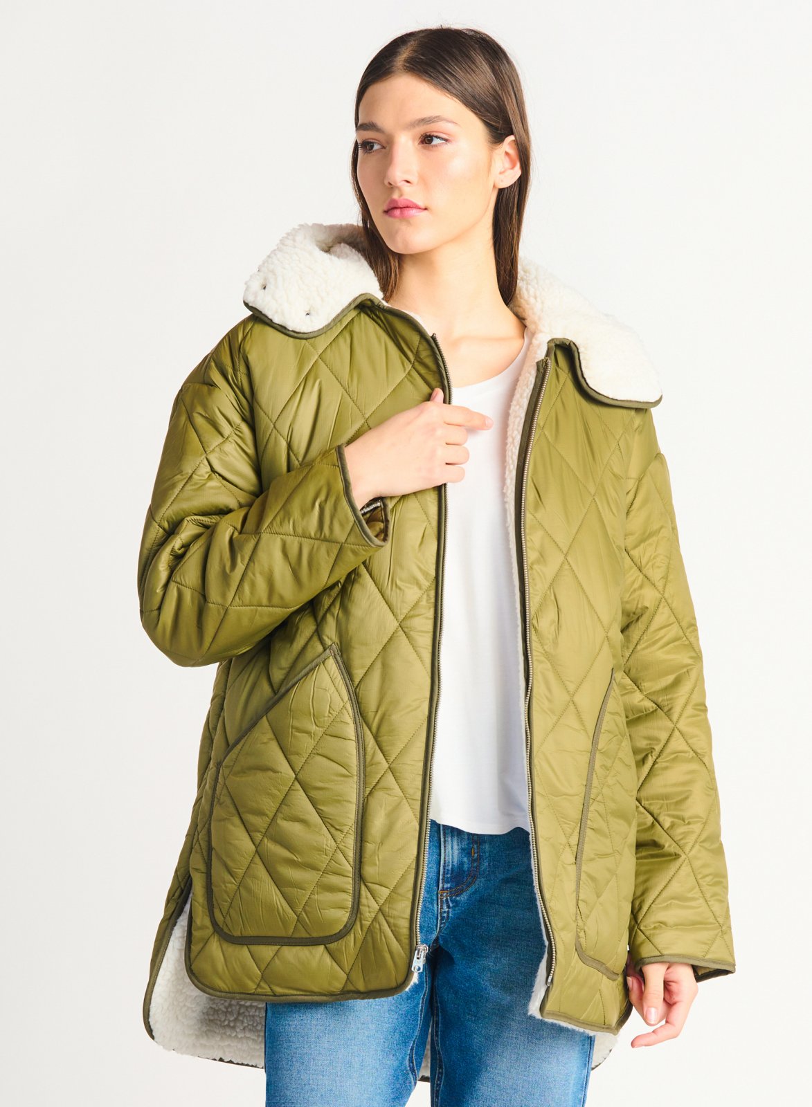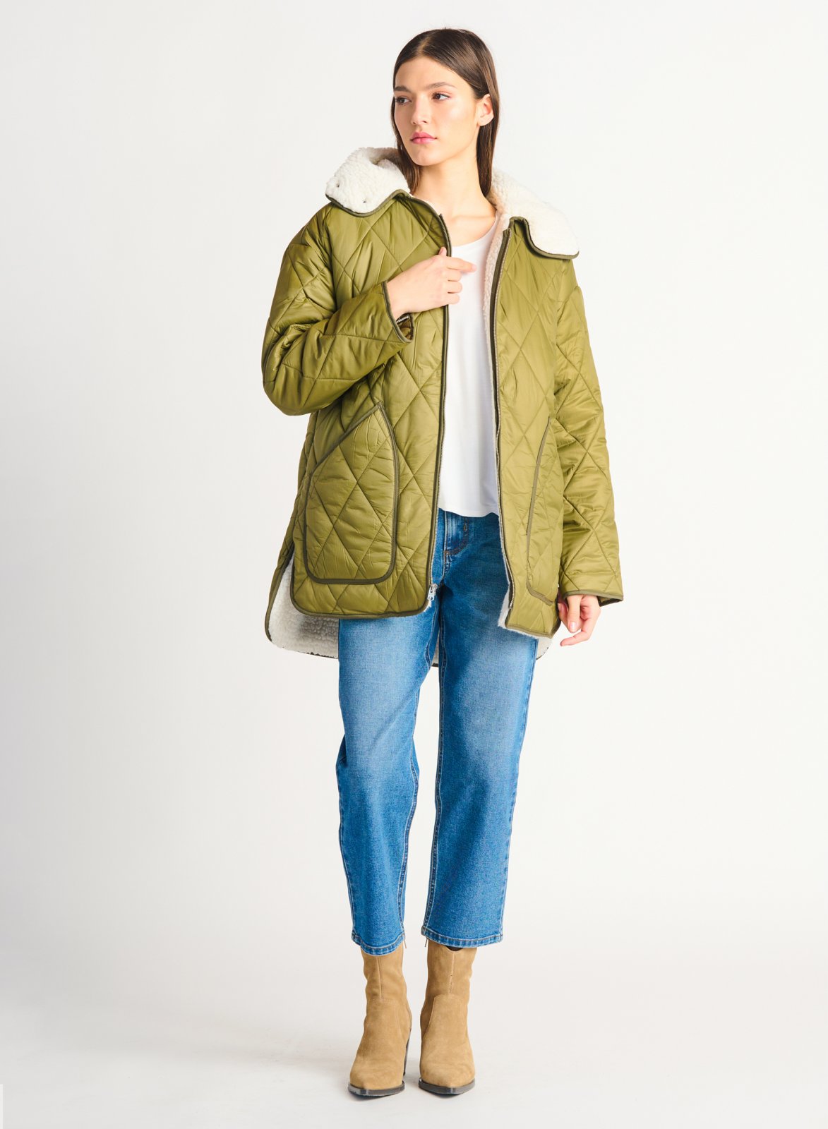 Dex Ladies Sherpa Lined Quilted Olive Green Jacket