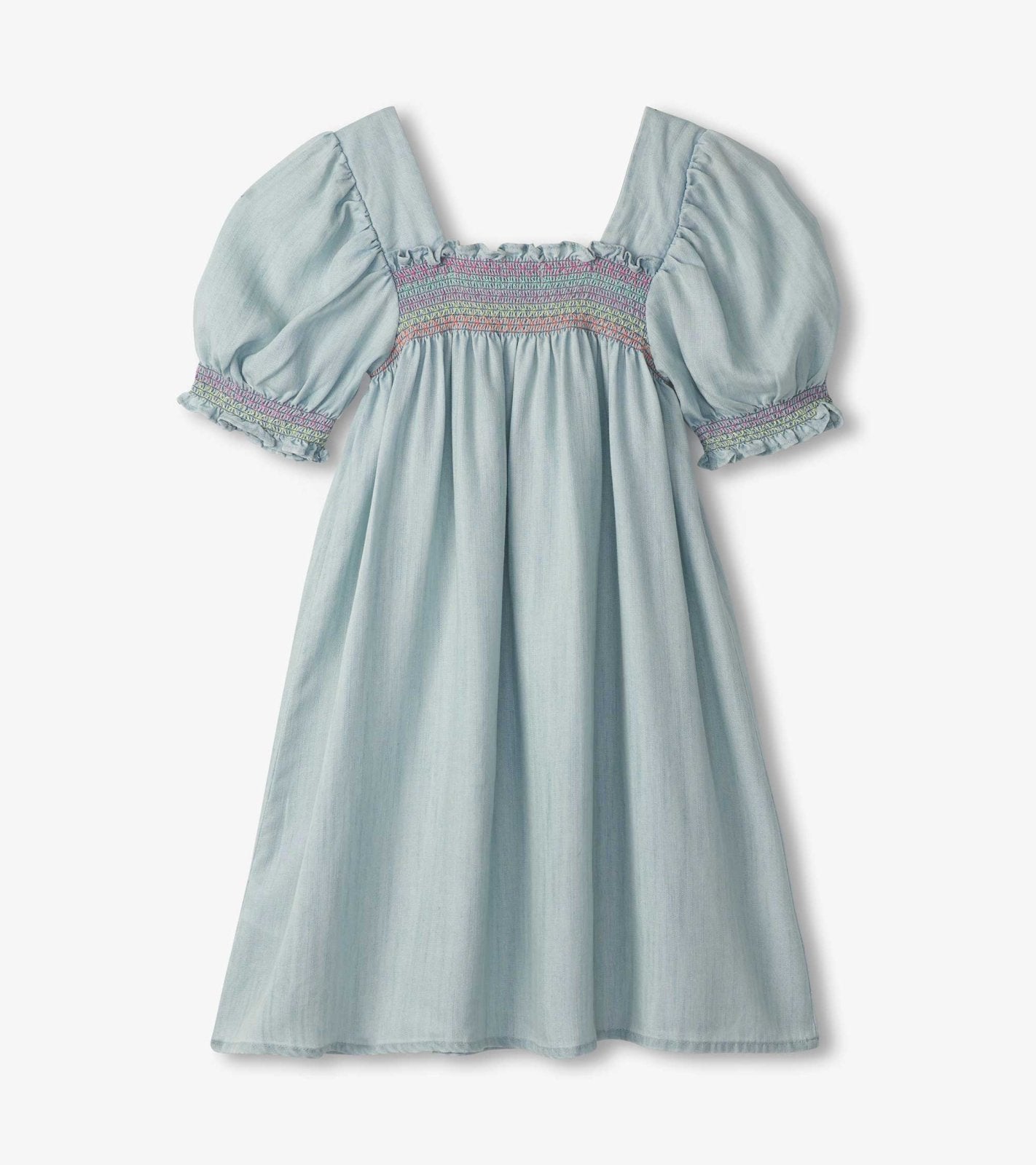 Hatley Girls Soft Denim Blue Puff Sleeve Smocked Dress
