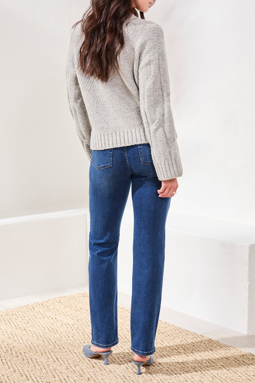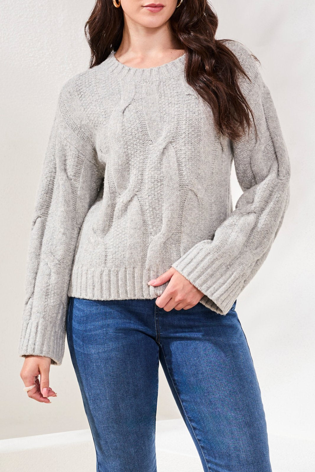 Tribal Ladies Grey Mix Crew Neck Loose Fit Cable Sweater